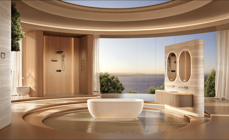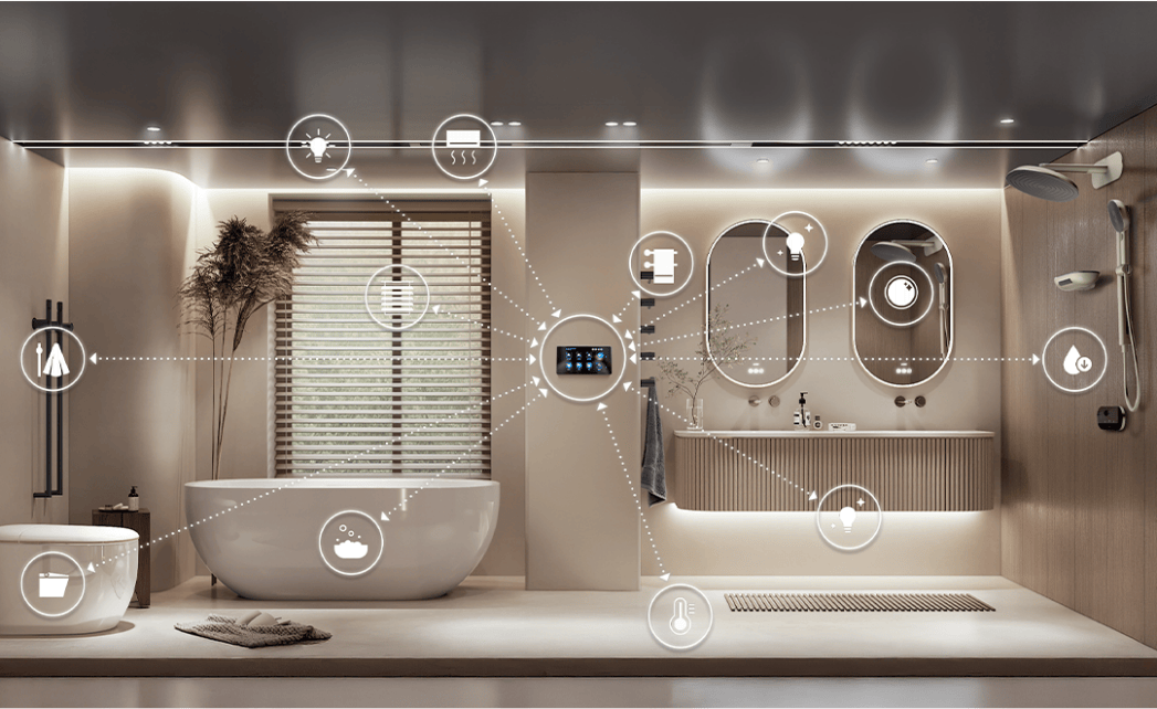恩仕全景聪敏浴室以「无感交互,聪敏恬逸」为主题,打制硬件与软件深度调解的一体化卫浴处分计划。它粉碎古代卫浴修造功用决裂,整合智能坐便器、淋浴器等主题产物与情况限制体例,构修「感知、相应、优化」闭环生态,饱舞浴室从功用空间升级为身心疗愈空间。