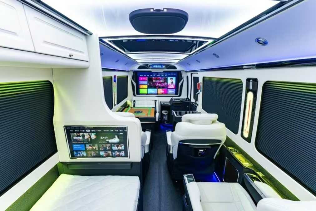 车顶可能看到众个阅读灯、扬声器、空调出风口以及后排文娱屏,中心再有一块安然天窗(低透光/弗成开启)。安一切分标配ESC、刹车优先编制、倒车雷达、高清倒车影像、驾驶员监测、三角警示牌、车速报警器、搭客门未合警备灯,而像灭火器(2个)、安然锤(6个)、车内提示标识、中门未合上警示、泊车楔2个、北斗/GPS双模双摄行车纪录仪(不含SIM卡)等规则哀求筑设也应有尽有。